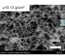 | ・軽量低密度(0.04〜0.2g/cm3) ・高い断熱性(熱伝導率:大気圧下で0.02W/mK) ・高い透明性 ・高い化学的安定性(成分は石英ガラスと同じSiO2) 高断熱性・軽量・透明性 ⇒ 窓・壁など透明断熱材への応用 低密度・透明性・安定性 ⇒ チェレンコフ光検出器、宇宙塵捕集材 多孔質性・安定性 ⇒ 吸音材、触媒担体など |