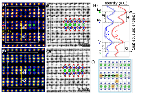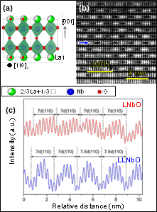 | ・手法: La(1-x)/3LixNbO3(LLNbO)、 La1/3NbO3(LNbO) 単結晶について走査透過型電子顕微鏡を用いて観察した |