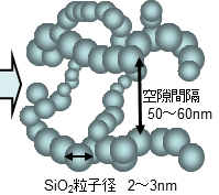 | ・高断熱性・軽量・透明性 ⇒ 窓・壁など透明断熱材への応用 ・低密度・透明性・安定性 ⇒ チェレンコフ光検出器、宇宙塵捕集材 ・多孔質性・安定性 ⇒ 吸着材、触媒担体など |