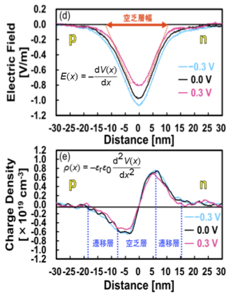 R-14 2018 電圧印加時GaAs p-n接合の電位・電場・電荷密度その場計測 動作時の半導体デバイスの電位・電場・電荷密度を定量的に計測する技術が無い ・ 電子顕微鏡内のデバイスを電圧印加や光照射により動作させることが困難 ・ 計測手法の精度および空間分解能が不十分 電圧印加その場観察技術と位相シフト電子線ホログラフィーを融合 ⇒動作時デバイスの電位・電場・電荷密度を高精度かつ高分解能で計測可能 (1) 電圧印加時のGaAs p-n接合の電位・電場・電荷密度の計測に成功した (2) 本手法は高精度(0.01 V)かつ高分解能(1 nm)な計測手法である (a) ホログラム、(b) 電位分布、(c) 電位プロファイル (d)電場プロファイル、(e)電荷密度プロファイル パワーデバイス、発光デバイス等の高性能半導体デバイスの品質管理 S. Anada et al., J. Appl. Phys. 122 (2017) 225702_1-8. 謝辞 : 本研究の一部は、文部科学省先端研究基盤共用促進事業(共用プラットフォーム形成支援プログラム)の支援を受けて実施したものである