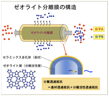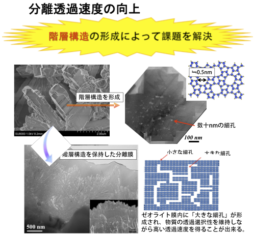 | 緻密なゼオライト多結晶体膜内に20〜30nmの細孔が内在した階層構造を確認 実際に抵抗となるゼオライト層は薄く、膜全体の透過抵抗は小さい |