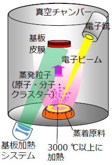 電子ビームPVDは蒸着原料を電子ビームで直接加熱・蒸発させることにより、従来技術では困難であった高融点セラミックスの高速成膜が可能なコーティング方法