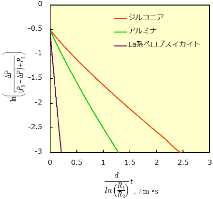 K:ガス透過率、ΔP:差圧、ΔP0:初期差圧、t:経過時間
