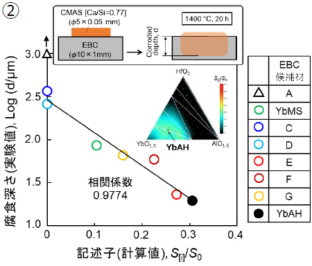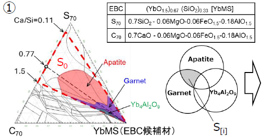 ①EBC候補材-CMASの擬三元系計算状態図中において、EBCの腐食度合いが反応生成相(Garnet、Apatite、Yb4Al2O9)の存在領域の割合に依存することを見出し、記述子S[i]/S0を提案