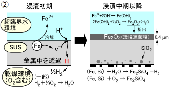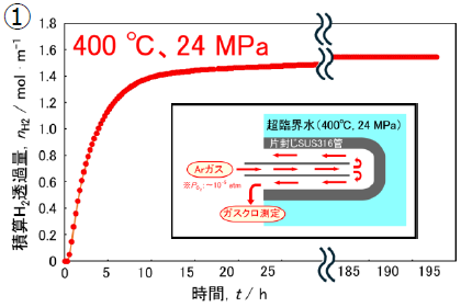 ②超臨界水側では、SUS管表面での溶解・析出により不働態膜のFe2O3層が時間経過に伴い形成するため、Feの溶解に伴うHの生成が抑制(H2透過速度が低下)