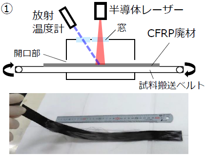 ①一次処理後のシート状CFRP廃材を搬送しながらレーザー照射することにより連続的に樹脂残渣を除去し、リサイクル一方向炭素繊維を得ることに成功
