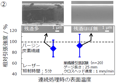②処理条件を最適化し、バージン炭素繊維に対する相対引張強度が90%以上、かつ樹脂残渣がほぼ無いリサイクル一方向炭素繊維の回収に成功