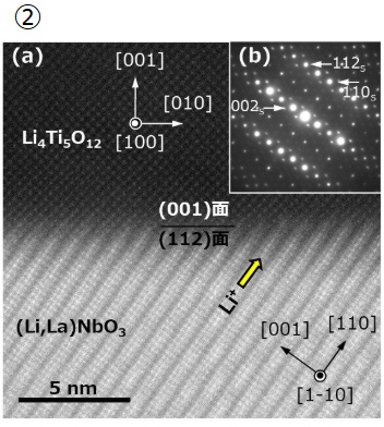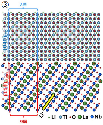 ③LTOの(040)面の7層の原子層が、LLNOの(114)面の9層の原子層と界面で一致していることを特定