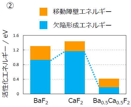 ②混合系Ba0.5Ca0.5F2において、イオン伝導に寄与する伝導キャリア(フッ化物イオン空孔・格子間フッ化物イオン)の欠陥形成エネルギーが低下しており、点欠陥の生成促進が伝導度向上の主要因であることを解明