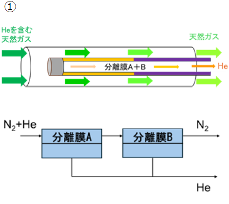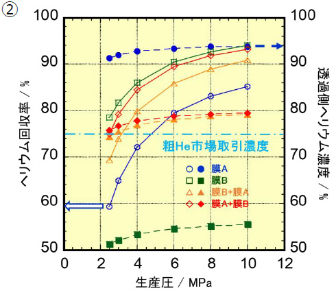 ・天然ガス坑井元分離における膜分離はガス田の生産圧を有効利用することで省エネルギー化が可能であるが、ガス田減退時の生産圧の低下によりヘリウム(He)の回収率が低下