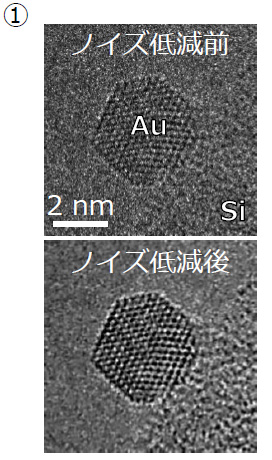 ①機械学習に基づくノイズ低減により1 msの時間分解能で明瞭なTEM像を取得することに成功