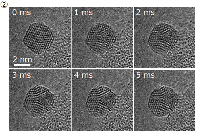 ②金ナノ粒子において1 msスケールで起こる構造・形状変化を可視化