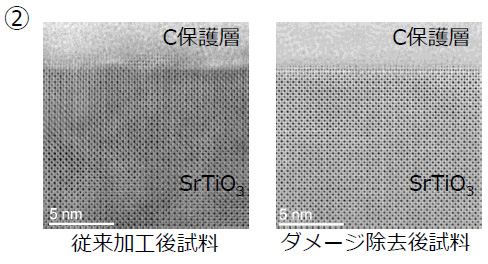 ②Π字形の試料形状にすることで従来のFIB加工で生じるダメージの除去が可能