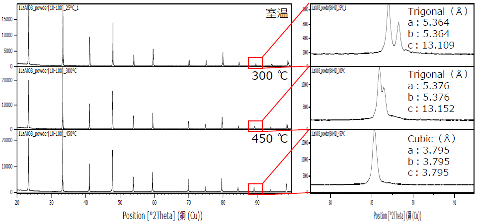 高温への昇温過程で起こるLaAlO3の三方晶から立方晶への相転位を確認