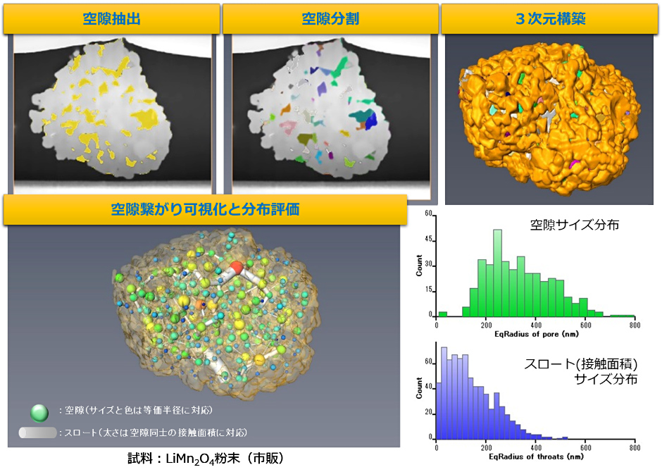 ・電池材料、粉末、各種焼結体における構造、体積、表面積、空隙、空隙のつながり、粒子径などの3次元評価