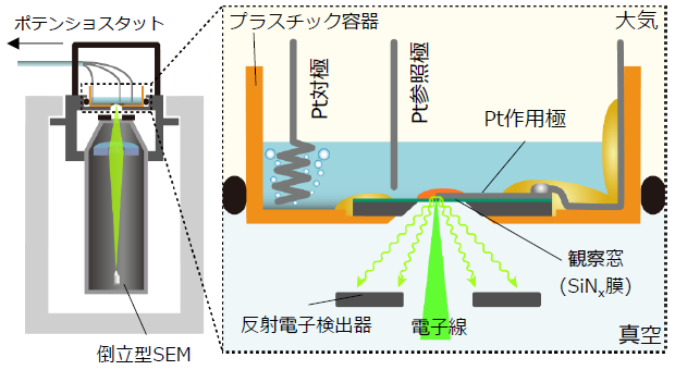 大気圧走査電子顕微鏡への電気化学反応システム導入により、液中反応のナノスケールその場観察を実現